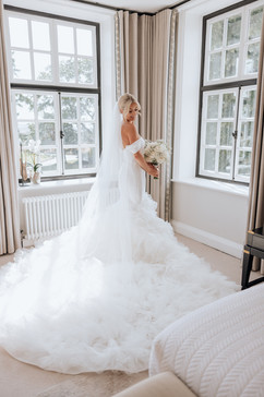 Esther looked absolutely breathtaking in her gown from Laura May Bridal. The fitted silhouette highlighted her elegance, while the dramatic tulle ruffle train added romantic movement and couture flair. The balance of structure and softness created a look that was both modern and timeless, catching the golden summer light beautifully as she walked through the gardens.
